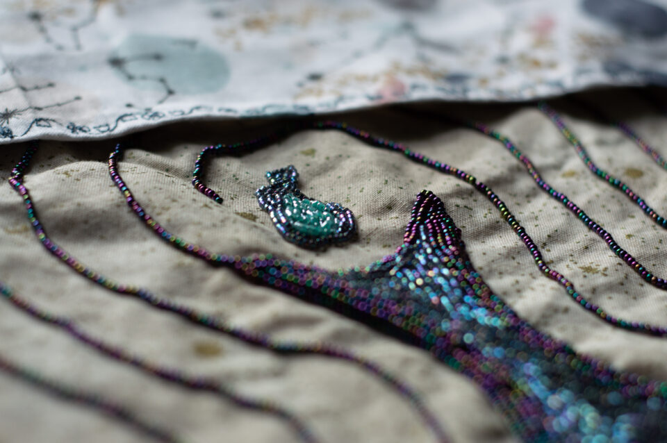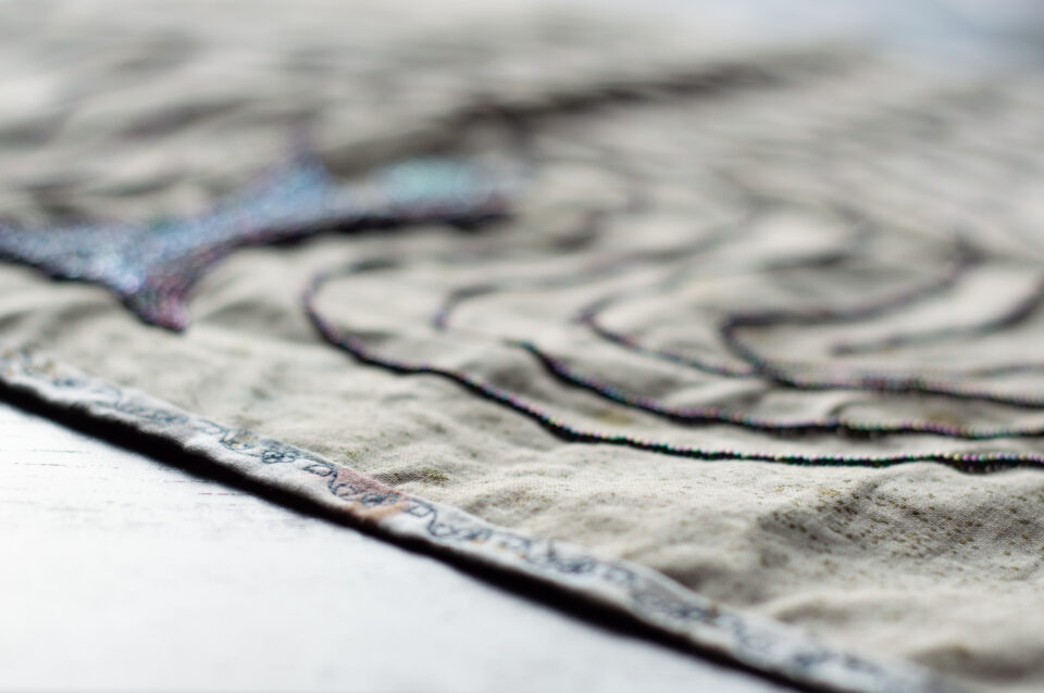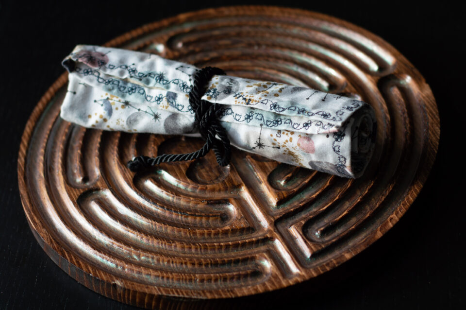 It wasn’t that difficult for me to decide on a first project: I wanted to make a beaded finger labyrinth. Because I was in the middle of nowhere without access to reference material or tools, and because I anticipated having to take it all apart anyway, I drew the pattern on the cloth free-hand. I decided on the Baltic wheel pattern I use in my branding and set to work.